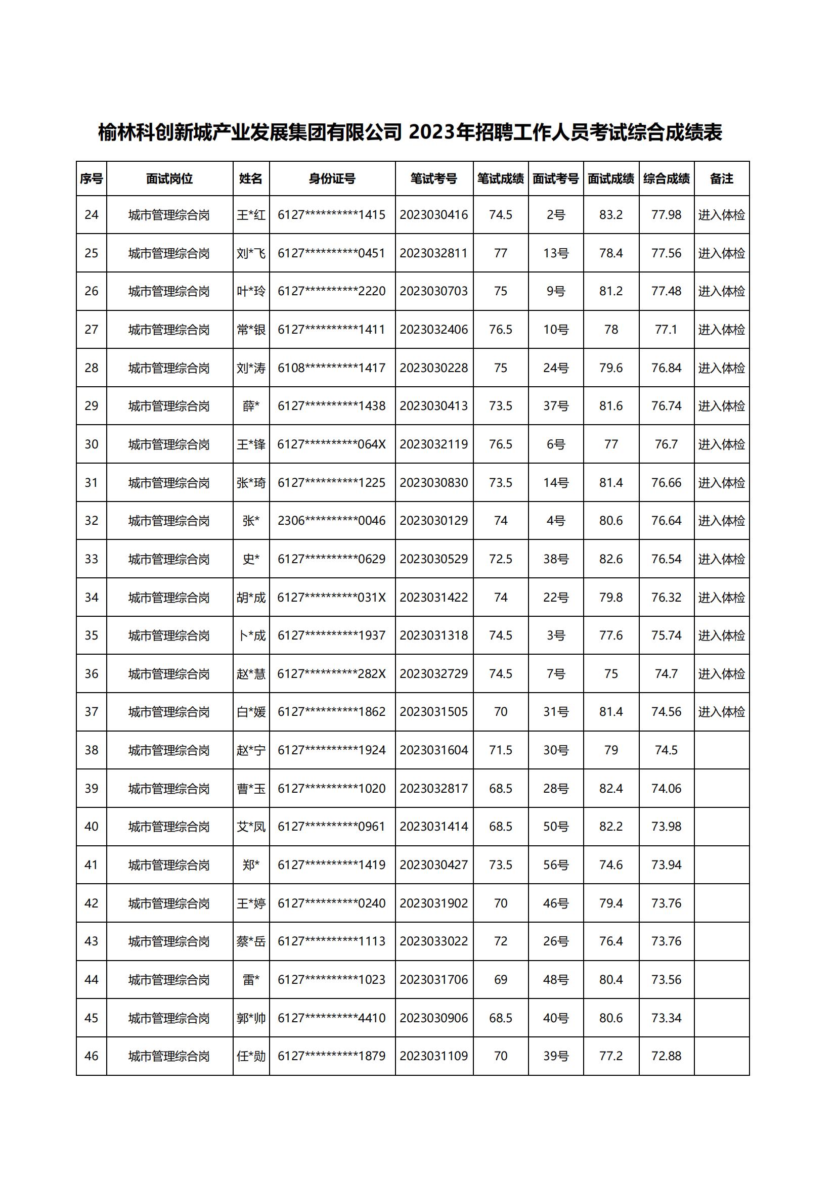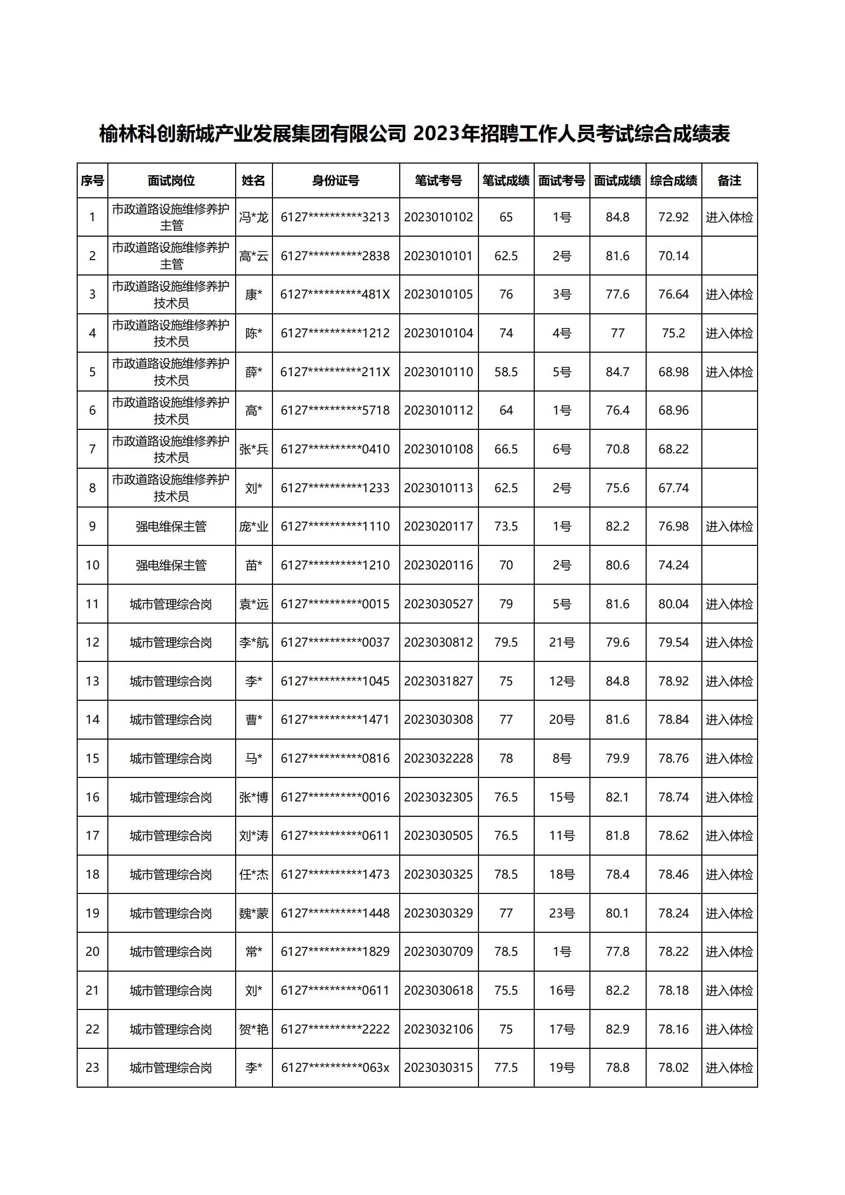 榆林科創(chuàng)新城產業(yè)發(fā)展集團有限公司2023年招聘工作人員面試成績、總成績及進入體檢人員公示